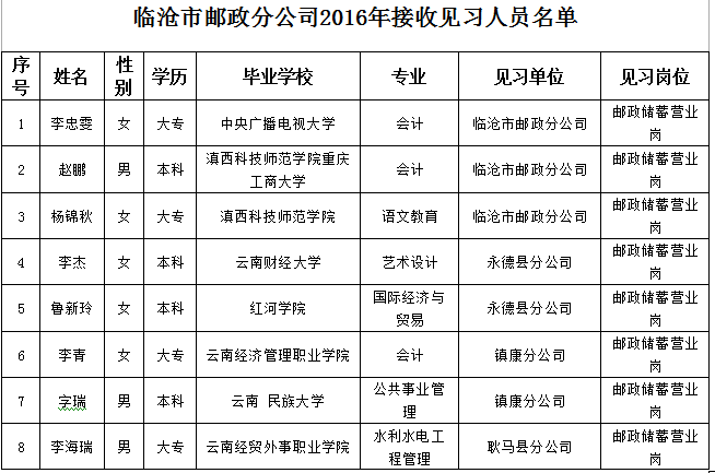 按照“公平、公正、公開(kāi)”的原則臨滄市郵政分公司員工接收見(jiàn)習(xí)人員面試已結(jié)束,經(jīng)紀(jì)檢監(jiān)察審定,現(xiàn)將擬錄用情況進(jìn)行公示如下: