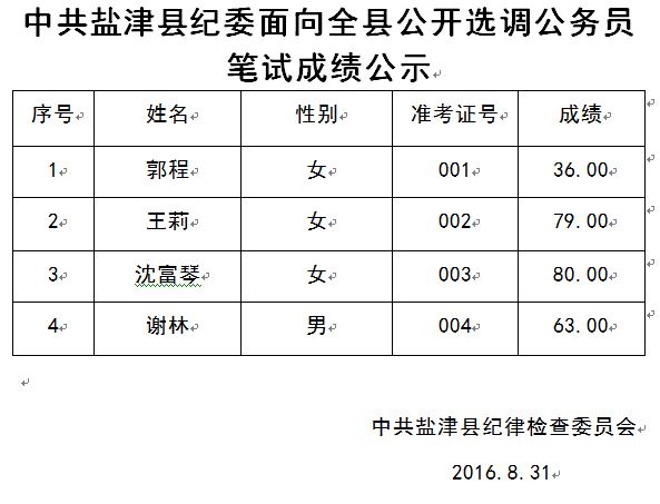 鹽津縣紀(jì)委面向全縣公開選調(diào)公務(wù)員筆試成績(jī)公示