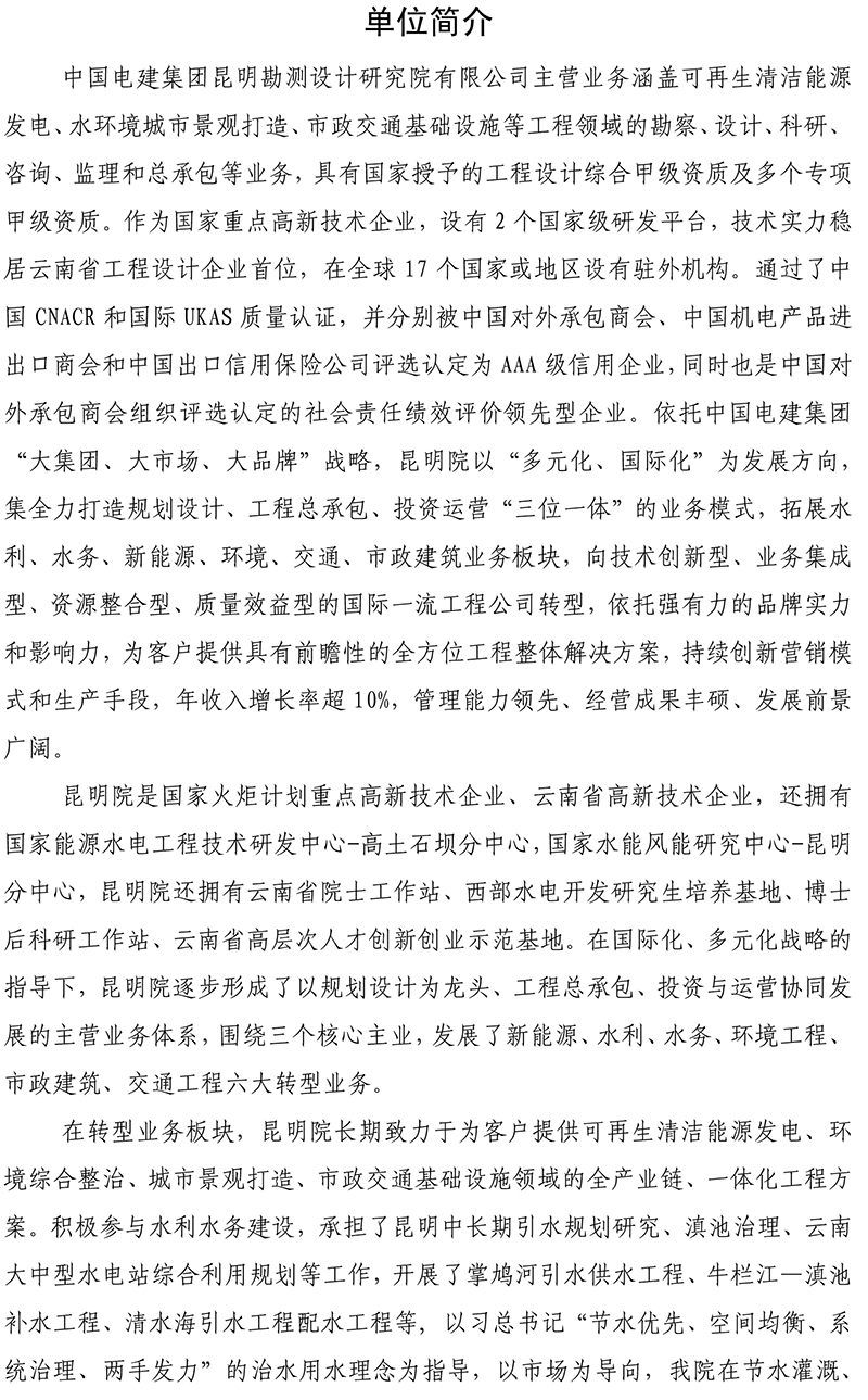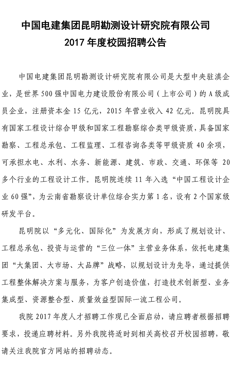 中國(guó)電建集團(tuán)昆明勘測(cè)設(shè)計(jì)研究院有限公司2017年度校園招聘公告
