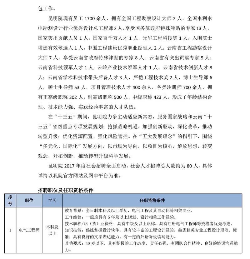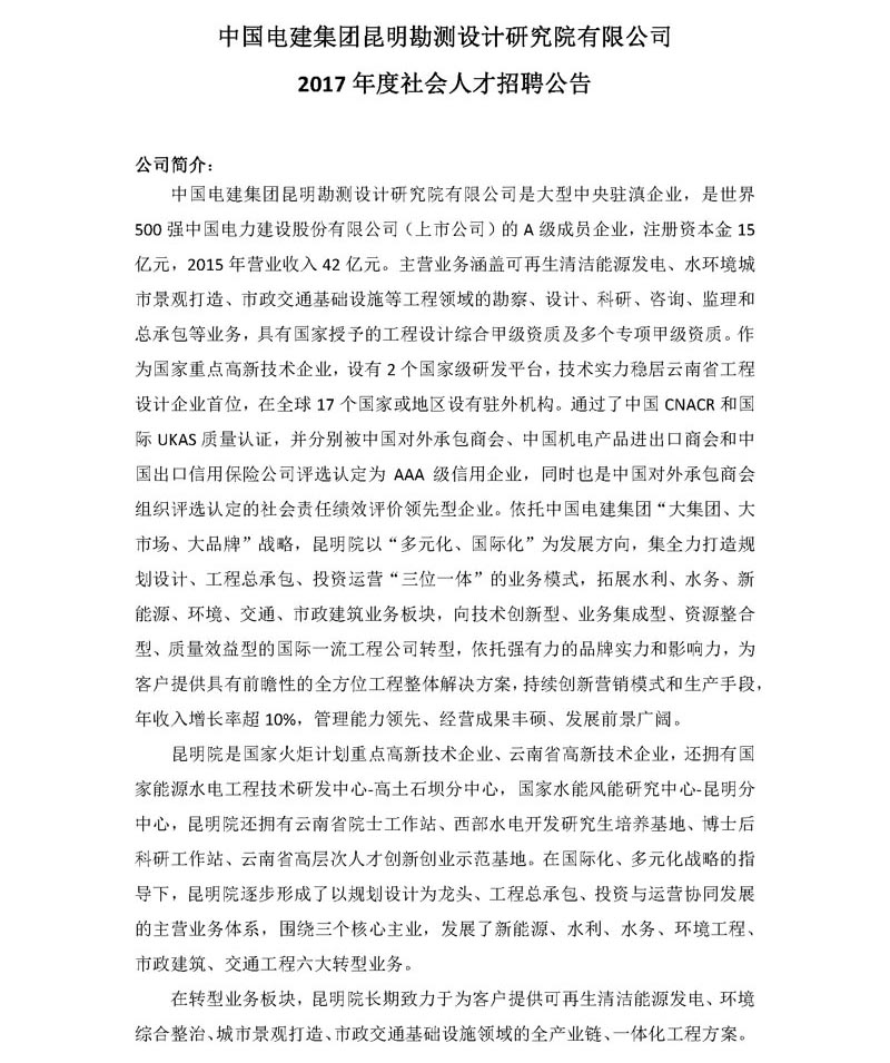 中國電建集團昆明勘測設(shè)計研究院有限公司 2017年度社會人才招聘公告