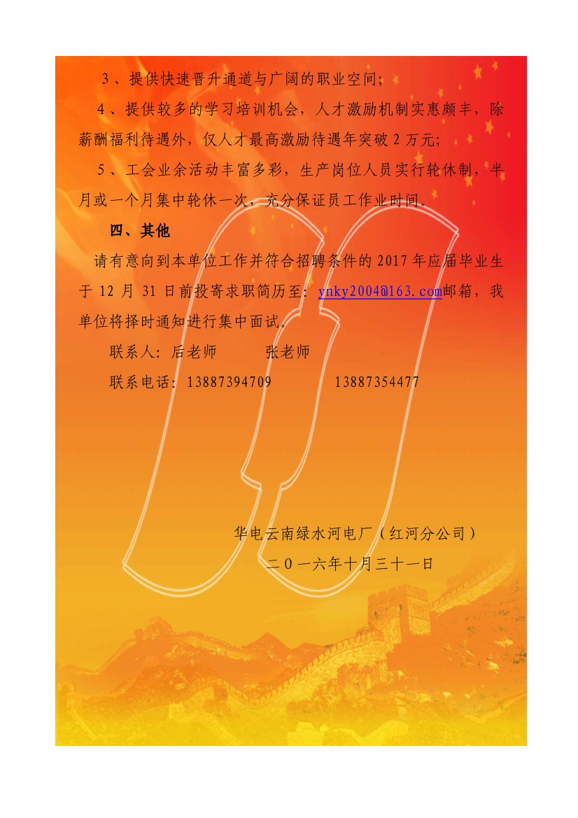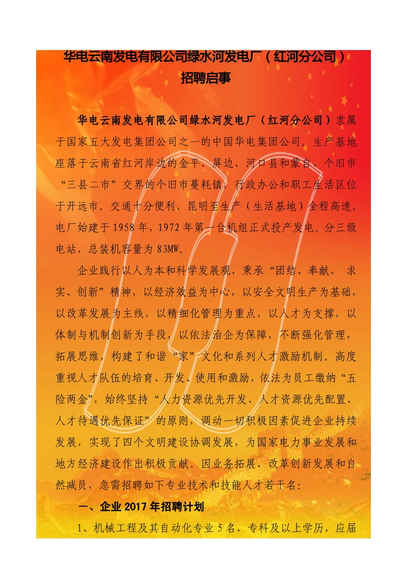 華電云南綠水河電廠(紅河分公司)2017年招聘啟事