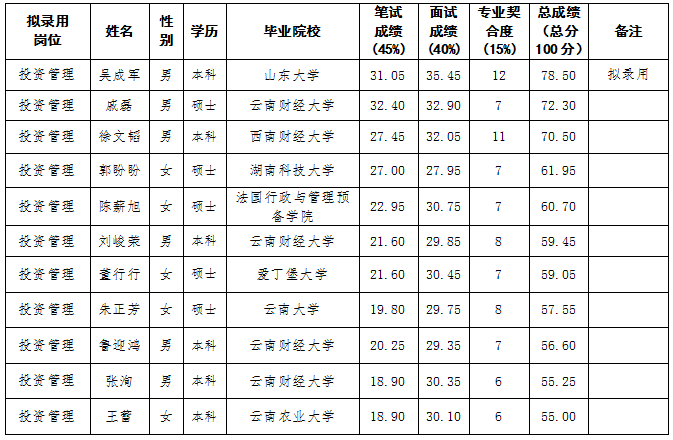 根據(jù)工作需要,綜合筆面試成績(jī)及排名,現(xiàn)對(duì)擬錄用人員進(jìn)行公示。如對(duì)擬錄用人員有異議,請(qǐng)及時(shí)向昆明軌道交通集團(tuán)有限公司紀(jì)檢監(jiān)察室反映。
