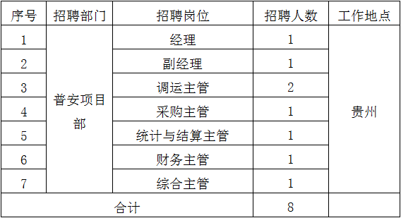 根據(jù)工作需要,現(xiàn)公開招聘普安項(xiàng)目部經(jīng)理等崗位8人。具體事項(xiàng)如下: