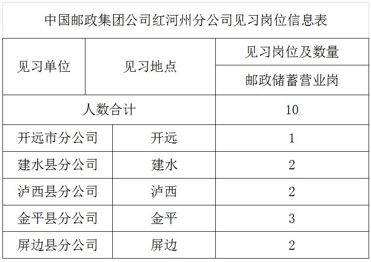 根據(jù)云人社發(fā)[2009]132號關(guān)于印發(fā)《云南省高校畢業(yè)生見習(xí)工作實施意見的通知》精神,為幫助高校畢業(yè)生通過就業(yè)見習(xí)升華理論知識、增長實踐技能、提升就業(yè)能力、盡快實現(xiàn)就業(yè),中國郵政集團公司紅河州分公司現(xiàn)面向社會提供10個見習(xí)崗位,現(xiàn)將見習(xí)崗位信息公布如下: