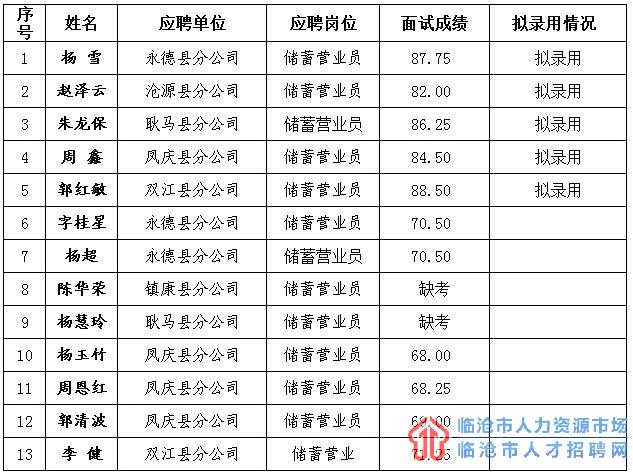按照“公平、公正、公開(kāi)”的原則臨滄市郵政分公司接收見(jiàn)習(xí)人員面試已結(jié)束,經(jīng)紀(jì)檢監(jiān)察審定,現(xiàn)將擬接收見(jiàn)習(xí)人員面試成績(jī)及擬錄用情況進(jìn)行公示如下: