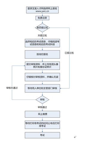 網(wǎng)絡(luò)報名的大致流程為:登錄玉溪人才網(wǎng)→網(wǎng)上報名入口→注冊→查看招聘崗位→按崗位報名并填寫報名資料→等待審核→審核通過→網(wǎng)上交費(注意查看交費狀態(tài),確認交費成功)→打印筆試準(zhǔn)考證(打印時間在筆試公告內(nèi)另行通知)→參加筆試。