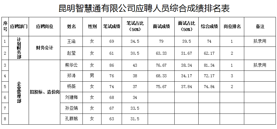 根據(jù)工作需要,昆明智慧通有限公司開展了第一批次部分崗位招聘錄用相關(guān)工作。根據(jù)綜合筆面試成績(jī)及排名,現(xiàn)對(duì)擬錄用人員進(jìn)行公示,如對(duì)擬錄用人員有異議,請(qǐng)及時(shí)向昆明智慧通有限公司反映。
