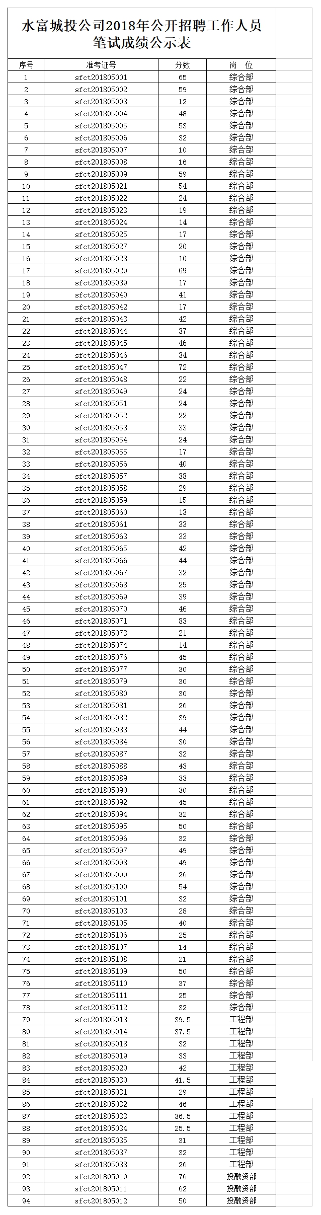 昭通市水富城投公司2018年招聘工作人員筆試成績(jī)公示