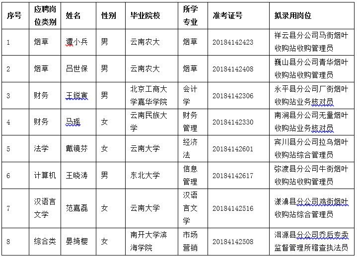 云南省大理煙草專賣局(公司)2018年大學(xué)畢業(yè)生招聘擬錄用人員公示