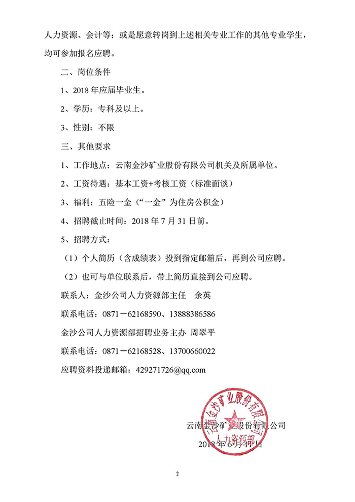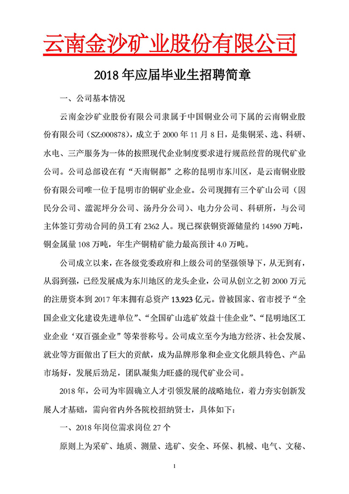 云南金沙礦業(yè)2018年應(yīng)屆畢業(yè)生招聘簡章