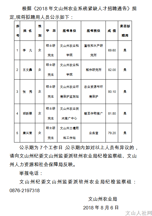 018年文山州農(nóng)業(yè)系統(tǒng)直屬事業(yè)單位緊缺人才招聘擬聘用人員公示
