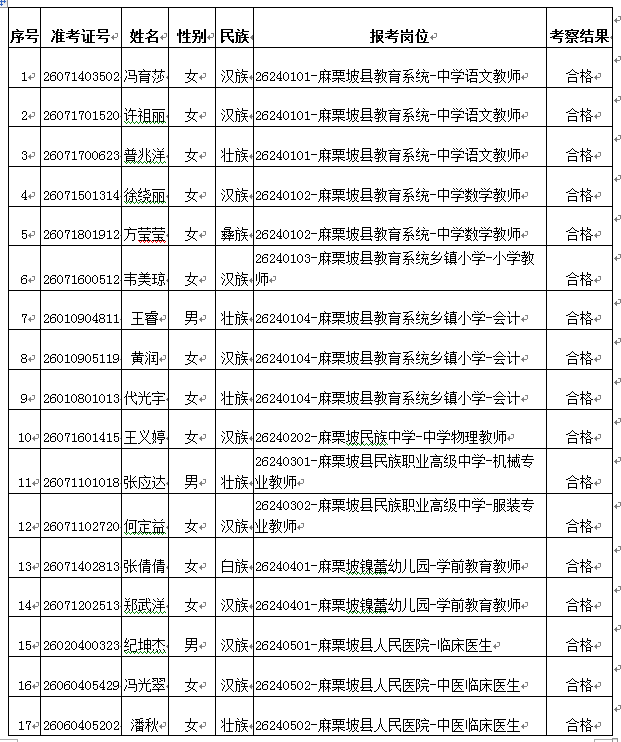 2018年麻栗坡縣事業(yè)單位公開招聘工作人員考察結(jié)果