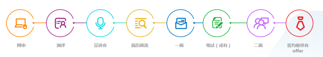 A:網(wǎng)申-測評-宣講會-簡歷篩選-一面-筆試(或有)-二面-簽約座談會/Offer。