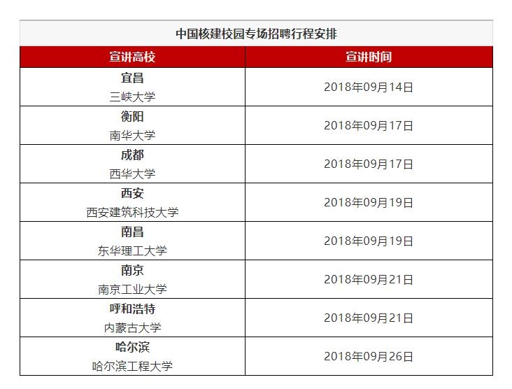 為做好2019屆高校畢業(yè)生招聘工作,中國(guó)核建組織下屬成員單位,將于2018年9月14日至26日在湖北宜昌、湖南衡陽等8個(gè)城市舉辦校園專場(chǎng)招聘會(huì),招聘崗位涉及土建技術(shù)、安裝技術(shù)、工程管理、經(jīng)濟(jì)管理等多個(gè)學(xué)科領(lǐng)域近200個(gè)專業(yè),提供近2000個(gè)工作崗位。中國(guó)核建將為廣大優(yōu)秀畢業(yè)學(xué)子提供有競(jìng)爭(zhēng)力的薪酬福利待遇、系統(tǒng)的人才培養(yǎng)方案和暢通的職業(yè)發(fā)展通道,歡迎廣大畢業(yè)生踴躍參與!