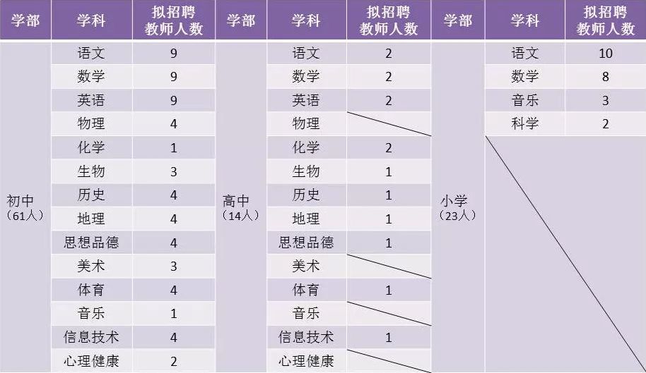 為滿足社會(huì)對(duì)優(yōu)質(zhì)教育資源的需求,根據(jù)學(xué)校辦學(xué)發(fā)展需要及人才儲(chǔ)備計(jì)劃,今年,我校建設(shè)路校區(qū)、昆明湖校區(qū)及潤(rùn)城學(xué)校面向省內(nèi)外招聘德才兼?zhèn)涞膬?yōu)秀教師,具體如下: