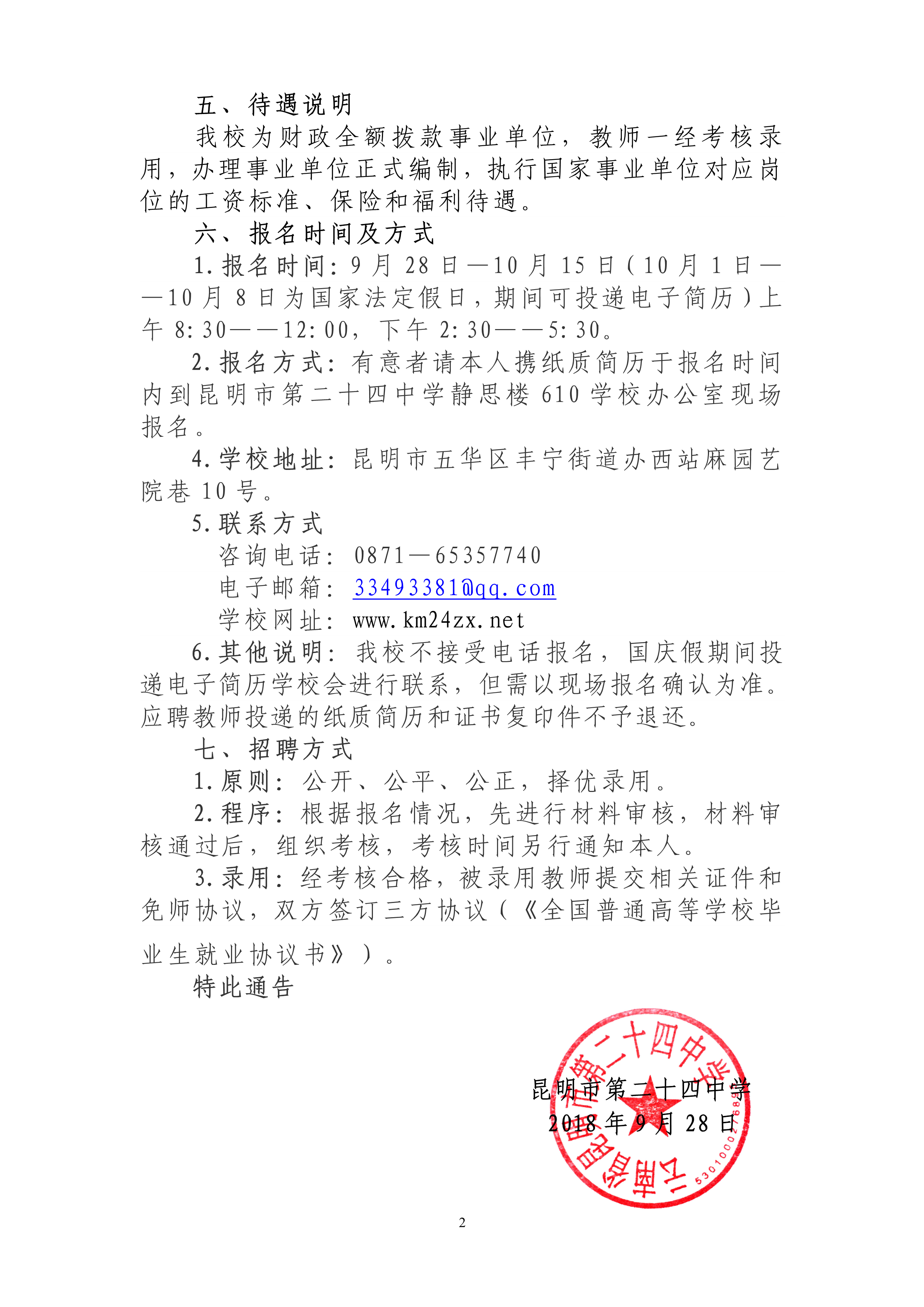 昆明市第二十四中學(xué)2019屆免師招聘通告