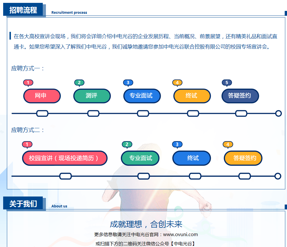 基本要求:本科以上學歷,CET-4及以上,認同中電光谷企業(yè)文化 ,身體健康、積極進取、樂觀誠信、責任心強 、良好的溝通、組織協(xié)調(diào)能力,具備團隊合作精神
