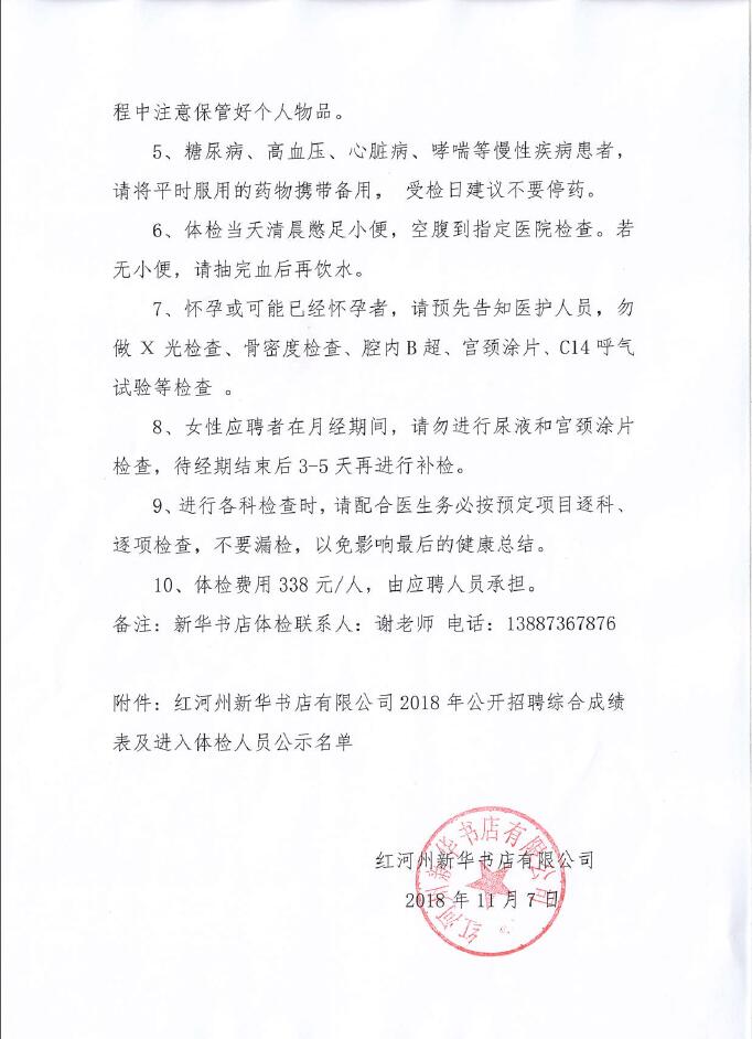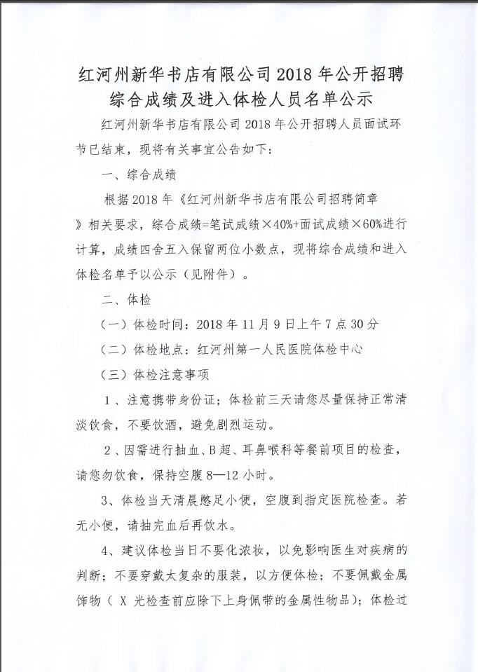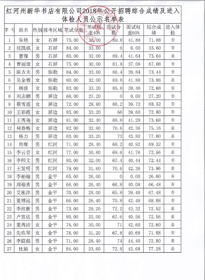 紅河州新華書店有限公司2018年公開招聘綜合 成績及進(jìn)入體檢人員名單公示