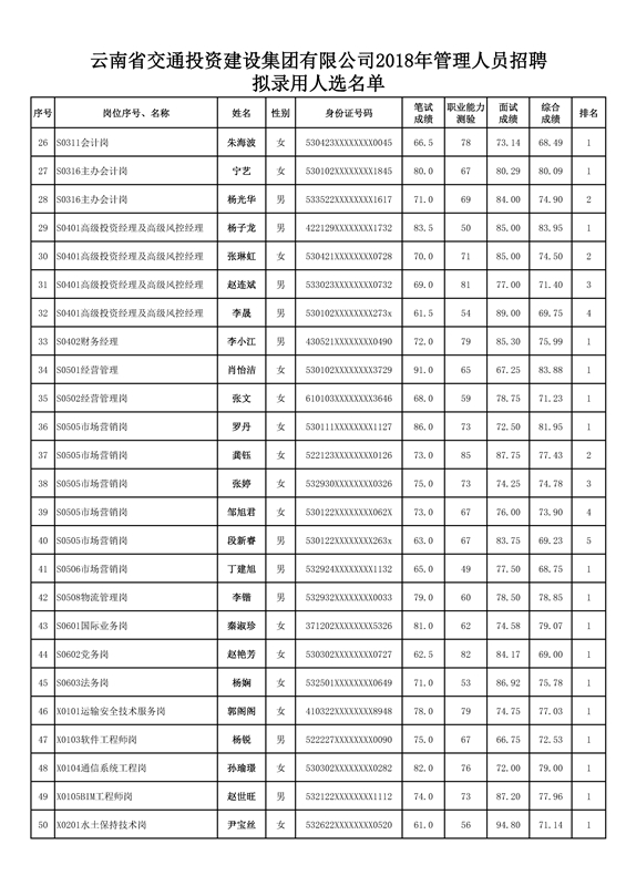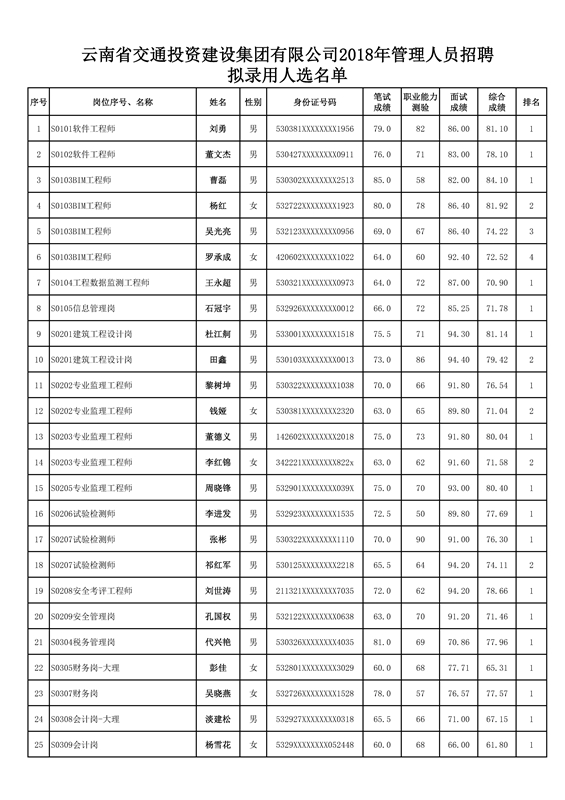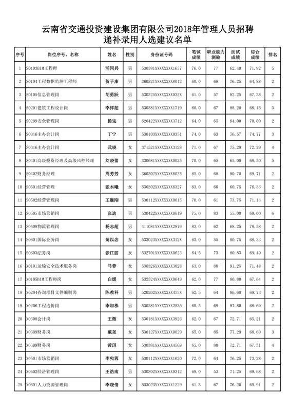 附件:1.云南省交通投資建設(shè)集團(tuán)有限公司2018年管理人員招聘擬錄用人選名單