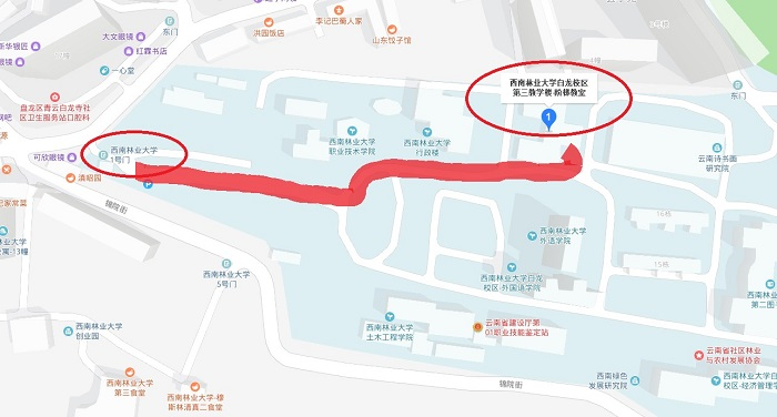 乘坐出租、滴滴等交通工具至西南林業(yè)大學(xué)一號(hào)門或市內(nèi)乘坐公交70路、75路、55路到終點(diǎn)站西南林業(yè)大學(xué)一號(hào)門,進(jìn)入一號(hào)門前行約200米至第三教學(xué)樓左側(cè)副樓2樓。