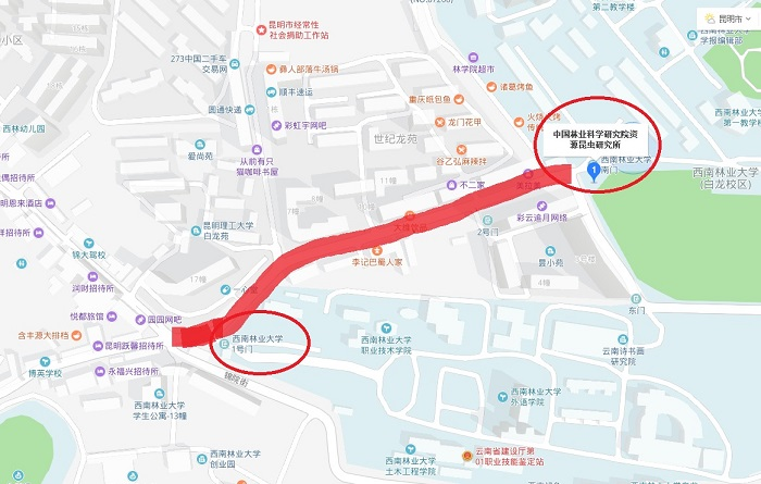 乘坐出租、滴滴等交通工具至西南林業(yè)大學(xué)二號(hào)門或成果公交70路、75路、55路到終點(diǎn)站西南林業(yè)大學(xué)一號(hào)門,沿主路前行約800米到西南林業(yè)大學(xué)二號(hào)門。二號(hào)門左側(cè)即為中國林業(yè)科學(xué)研究院資源昆蟲研究所。