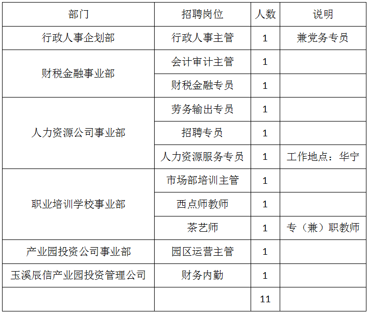 為滿足公司經(jīng)營(yíng)管理人才需求,2019年特面向社會(huì)招聘中層管理人員和基層員工11名,共11個(gè)崗位,具體招聘事宜公告如下: