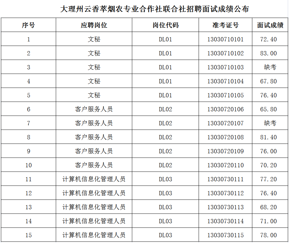 大理州云香萃煙農(nóng)專業(yè)合作社聯(lián)合社招聘面試成績(jī)公布