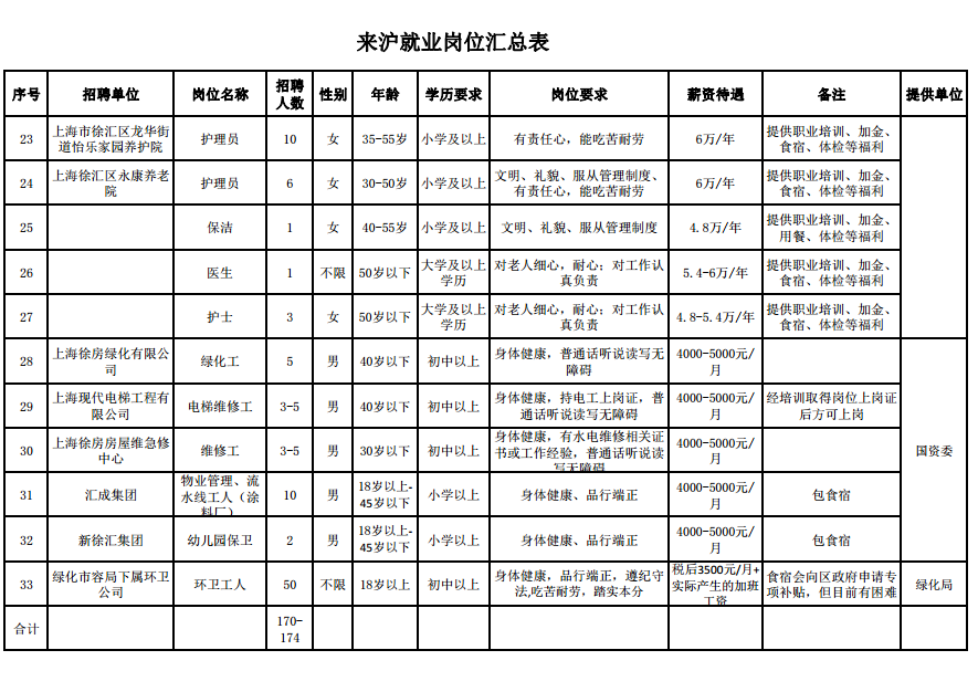 | 護(hù)理員 (太平養(yǎng)老集團(tuán)-福象養(yǎng)老院) | 15 | 不限 | 35-55歲 | 初中 | 1.能吃苦耐勞、不怕臟累,有愛心、耐心和責(zé)任心,有組織觀念,有感恩之心; 2.有護(hù)理員證書、特別優(yōu)秀者可以適當(dāng)放寬條件。 | 5000-5500 | 有住宿 | ||||
