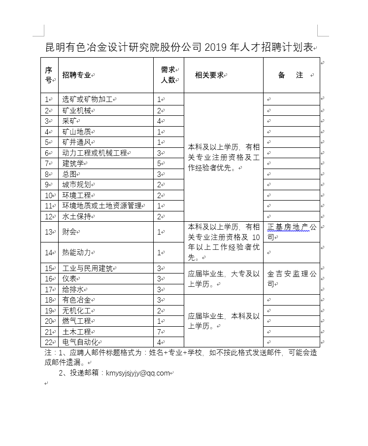 昆明有色冶金設(shè)計研究院股份公司2019年人才招聘計劃表