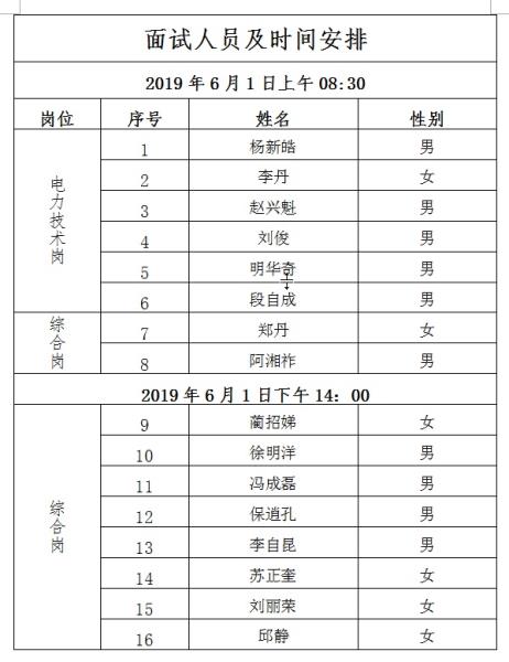 根據(jù)《德宏戶宋河發(fā)電有限責(zé)任公司2019年招聘公告》《德宏戶宋河發(fā)電有限責(zé)任公司2019年招聘筆試通知》,2019年5月26日,德宏戶宋河發(fā)電有限責(zé)任公司委托第三方組織了筆試考試,根據(jù)筆試成績(jī)排名,現(xiàn)將進(jìn)入面試人員名單通知如下: