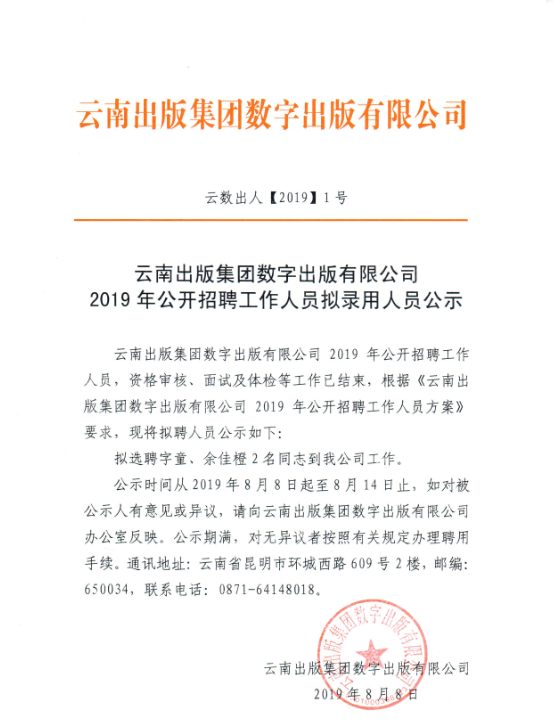 云南出版集團(tuán)數(shù)字出版有限公司2019年公開(kāi)招聘工作人員擬錄用人員公示