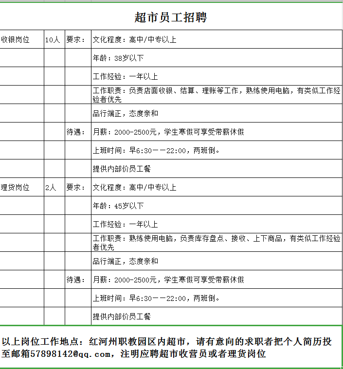 紅河州職教園區(qū)內(nèi)超市招聘收銀員10名