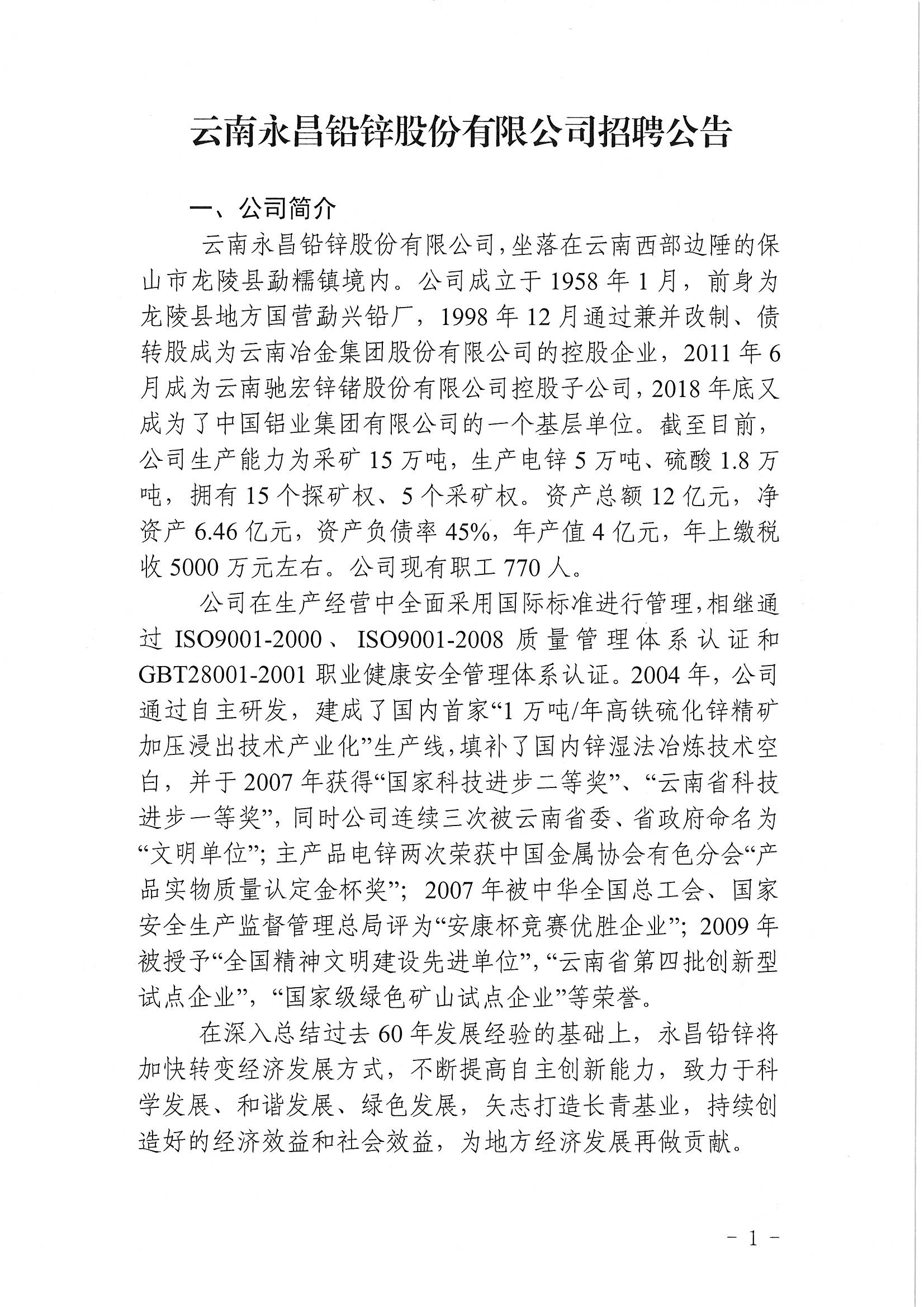 云南永呂鉛缽股份有限公司招聘公告