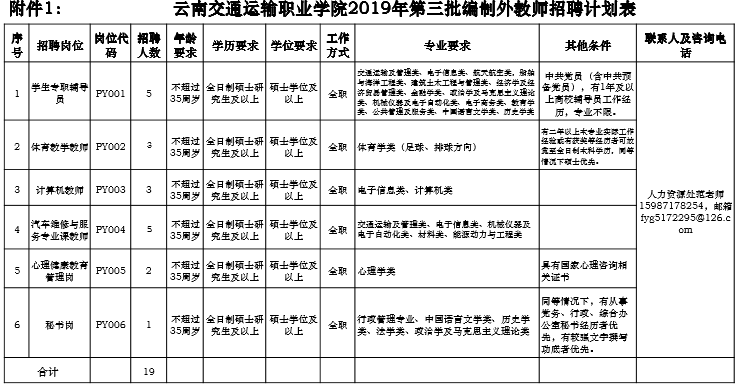 招聘崗位、專業(yè)及相關(guān)要求詳見《云南交通運(yùn)輸職業(yè)學(xué)院2019年編制外教師招聘計(jì)劃表》(附件1)。報(bào)名時(shí)間:2019年9月20日至10月6日。