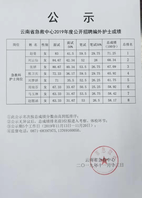 云南省急救中心2019年度公開招聘編外護(hù)士成績(jī)公示