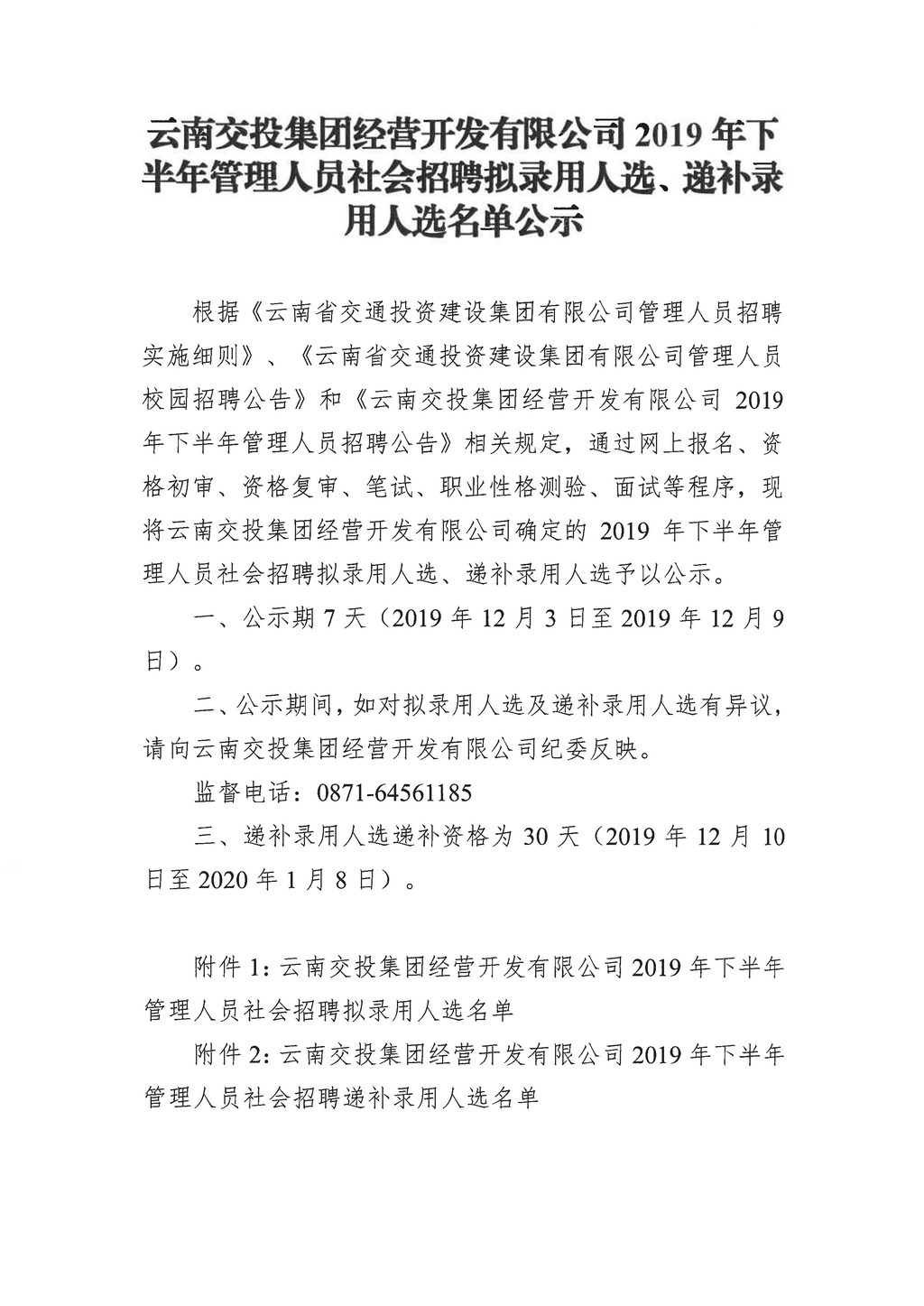 點擊查看:云南交投集團經(jīng)營開發(fā)有限公司2019年下半年管理人員杜會招聘擬錄用人選、遞補錄用人選名單