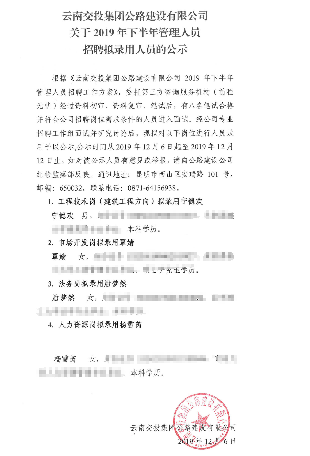 云南交投集團公路建設(shè)有限公司關(guān)于2019年下半年管理人員 招聘擬錄用人員的公示