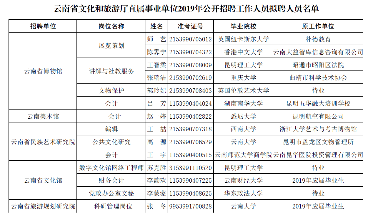 云南省文化和旅游廳直屬事業(yè)單位2019年公開招聘工作人員擬聘人員公示