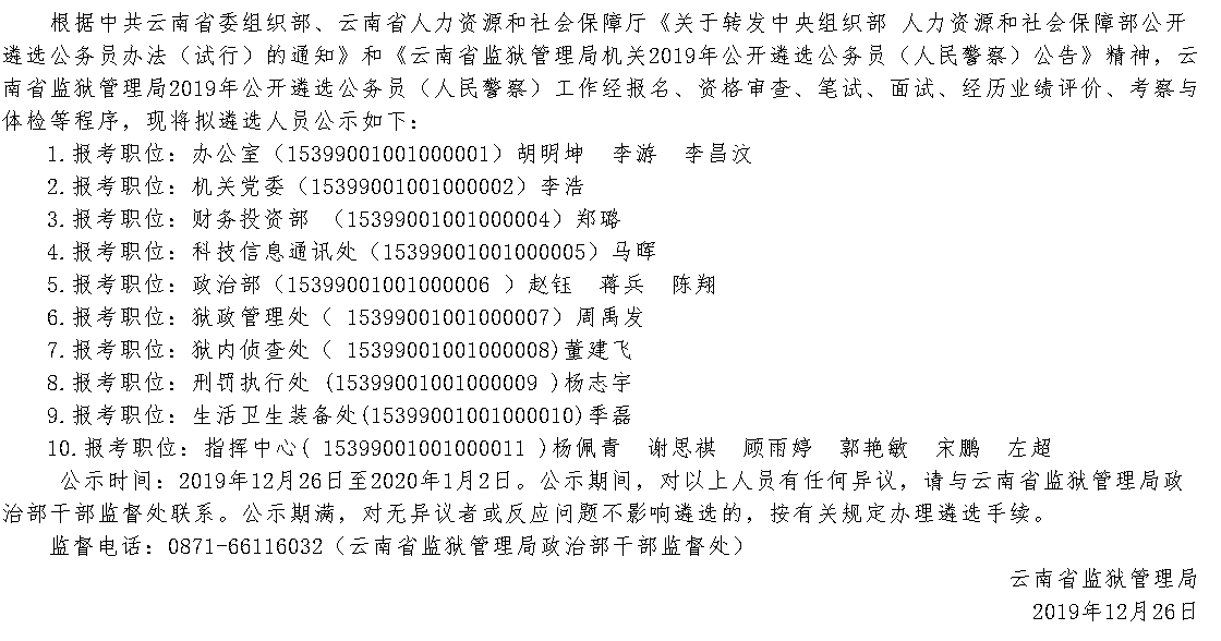 云南省監(jiān)獄管理局機(jī)關(guān)2019年公開遴選 公務(wù)員(人民警察)擬遴選人員公示