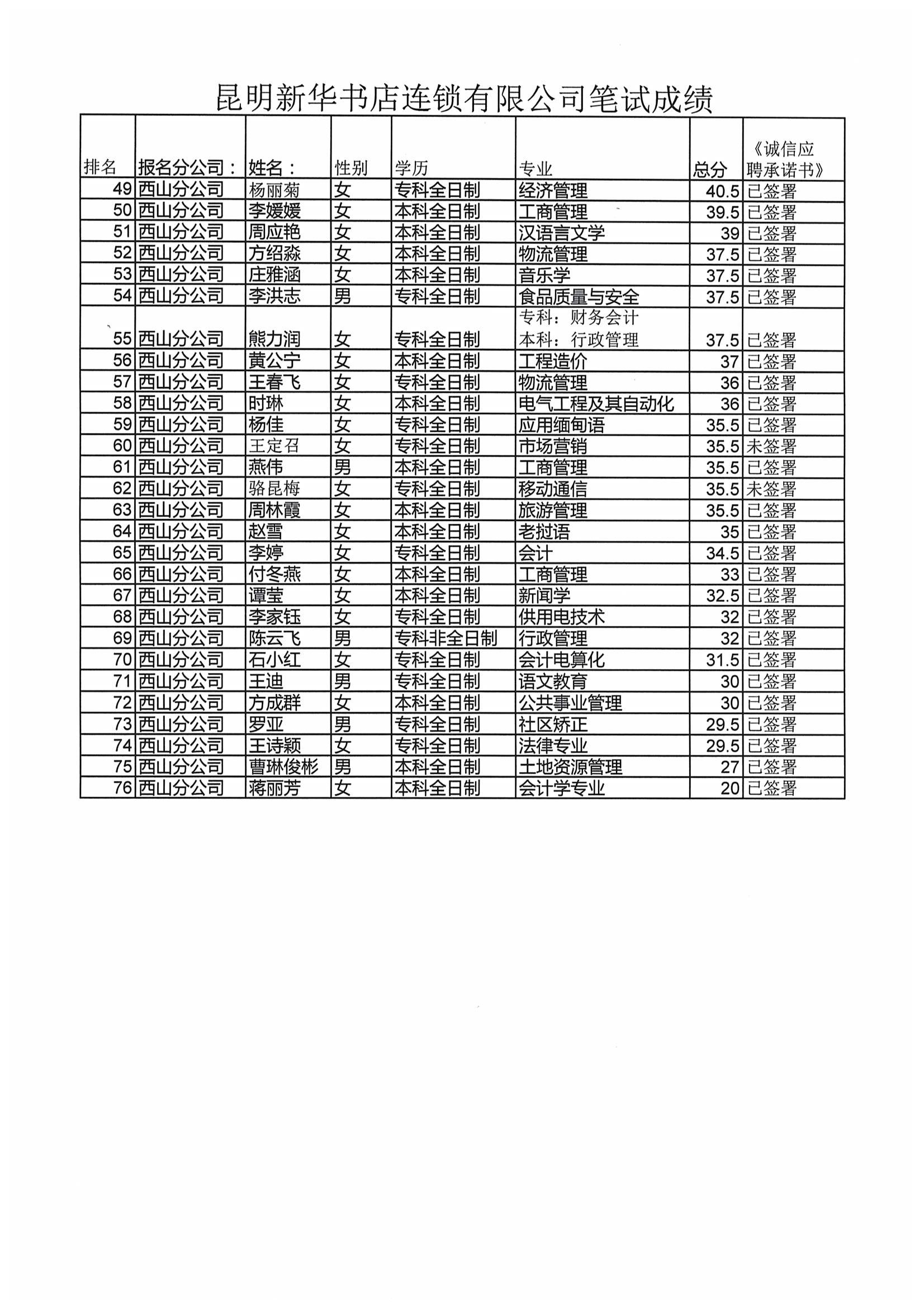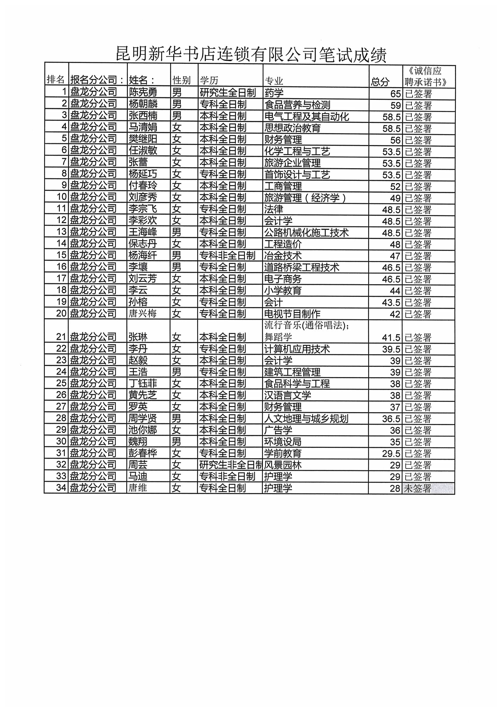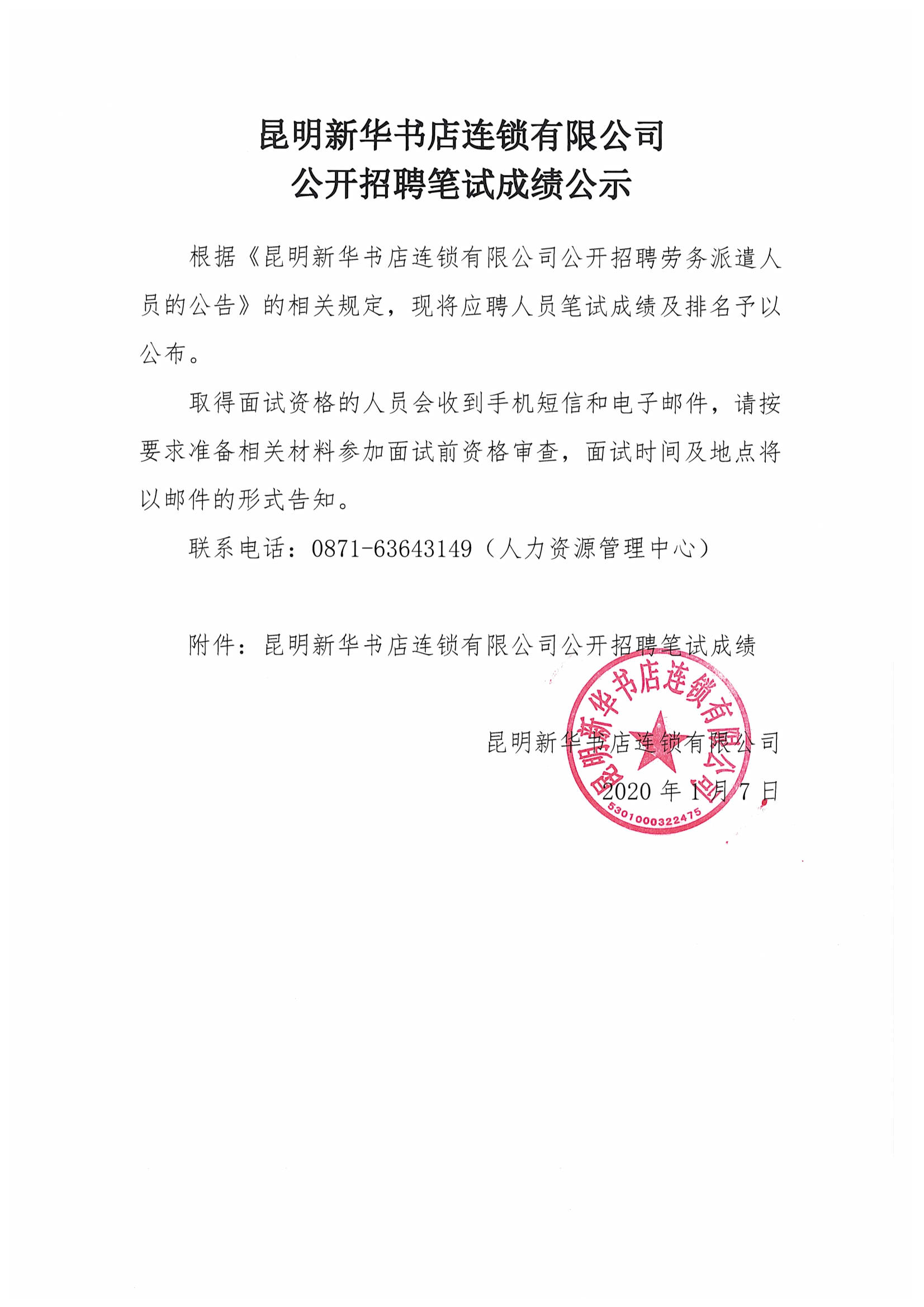 昆明新華書店連鎖有限公司公開招聘筆試成績(jī)公示
