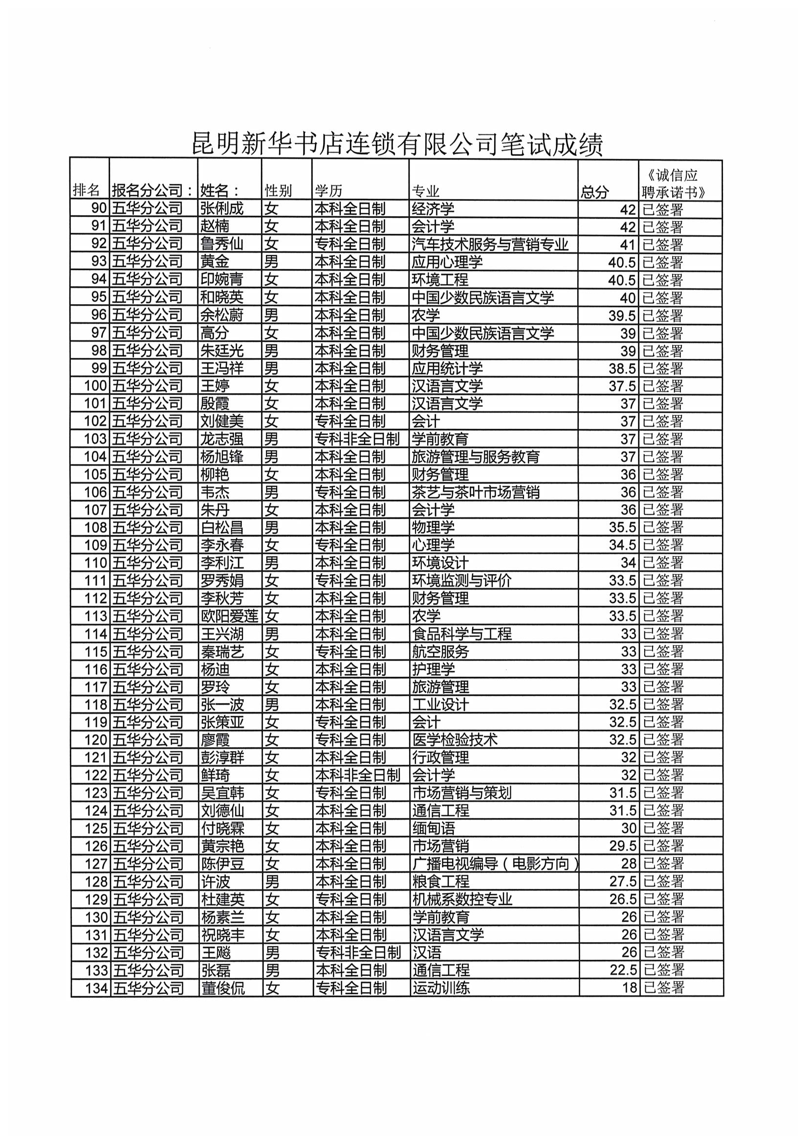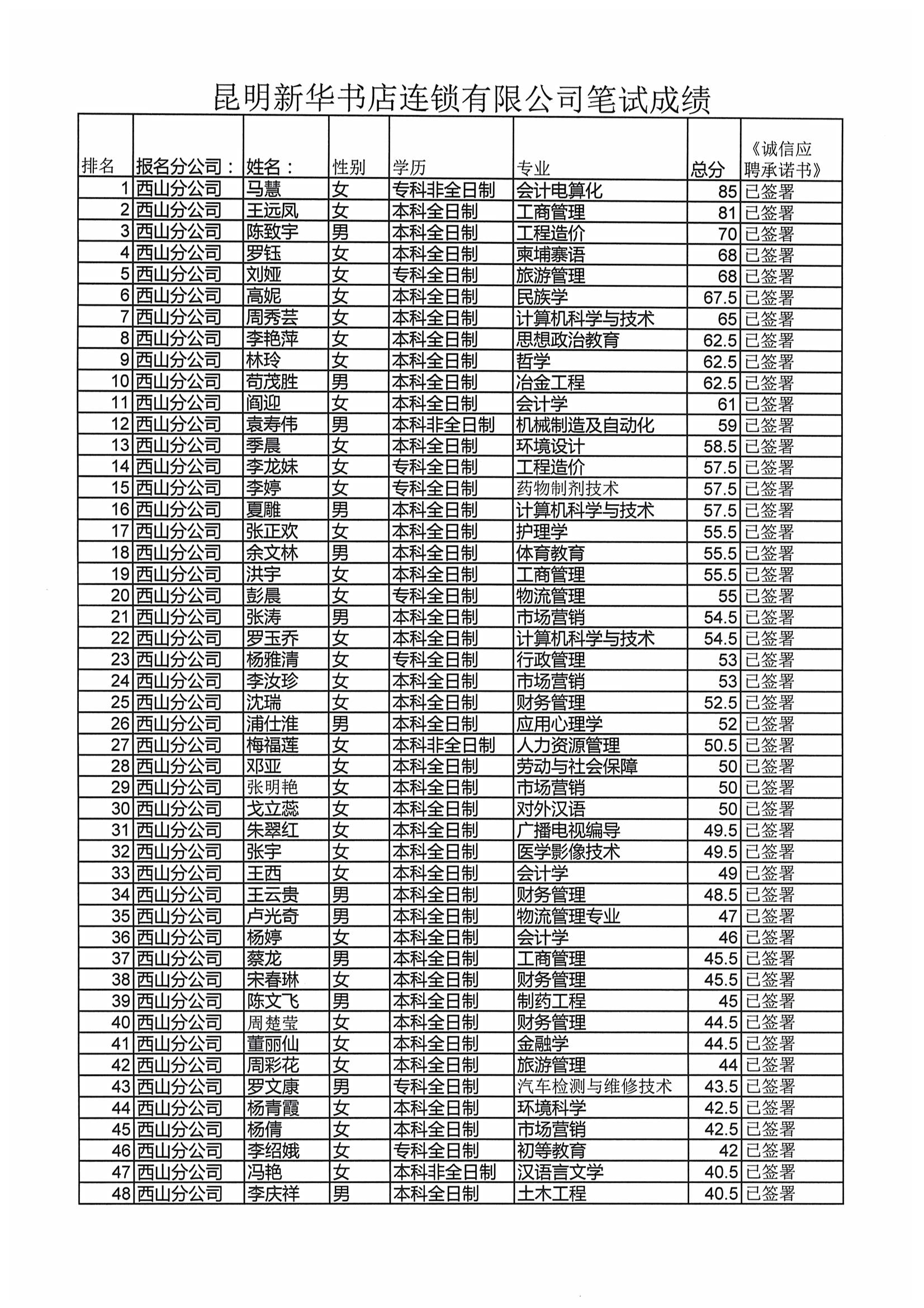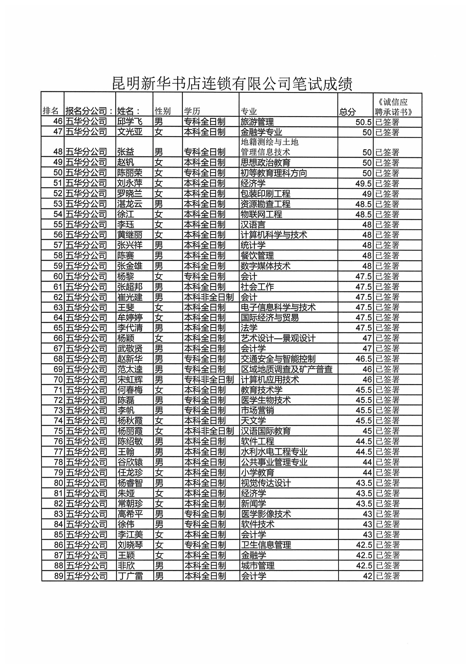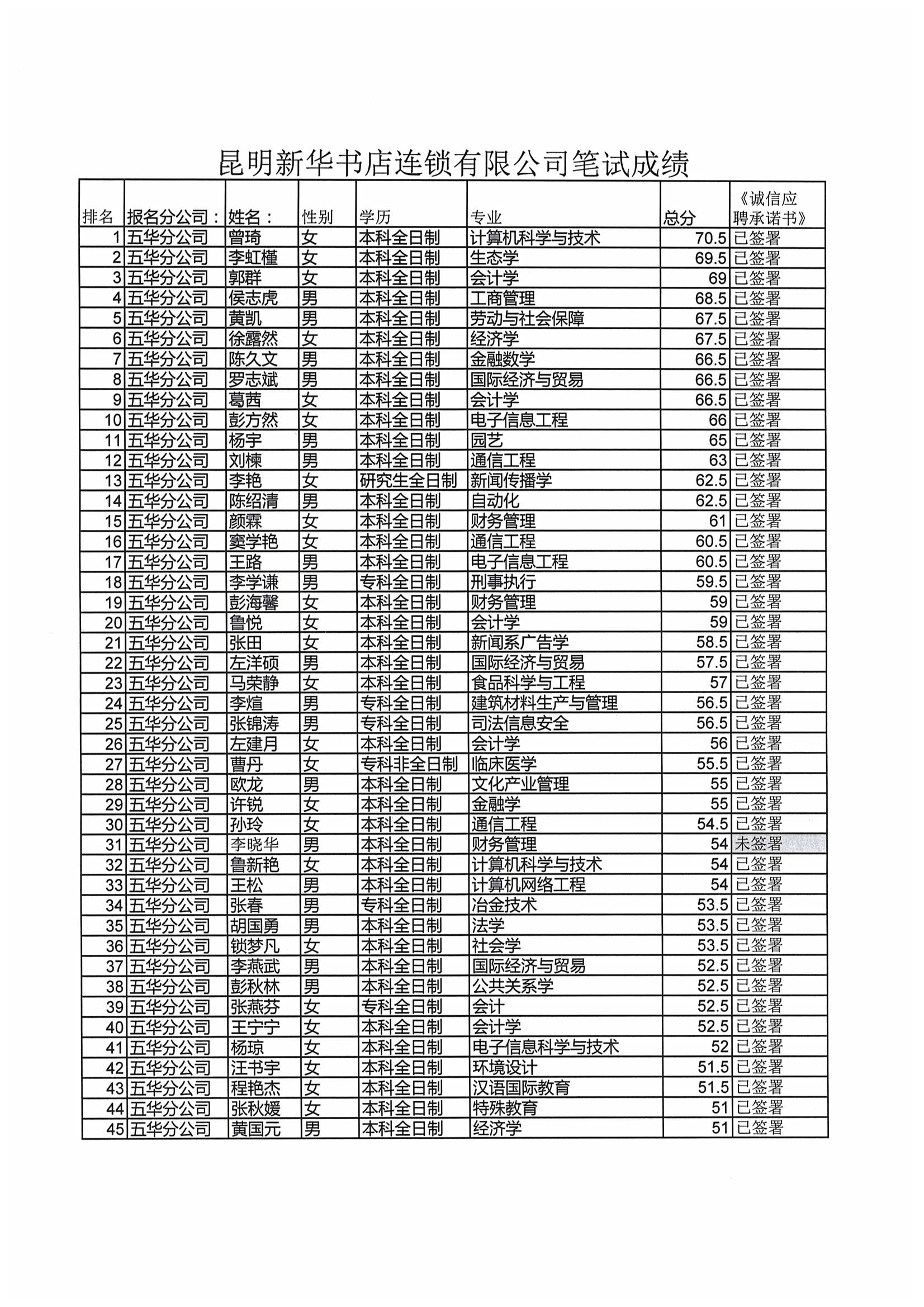 昆明新華書店連鎖有限公司公開招聘筆試成績(jī)公示