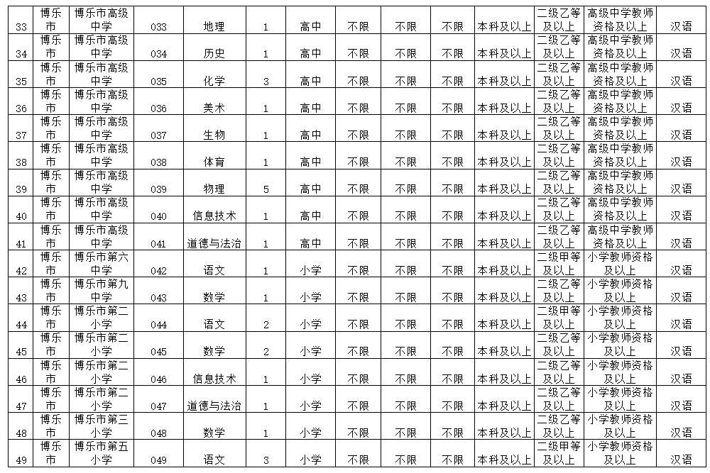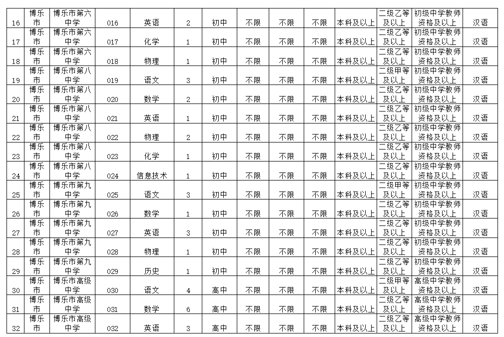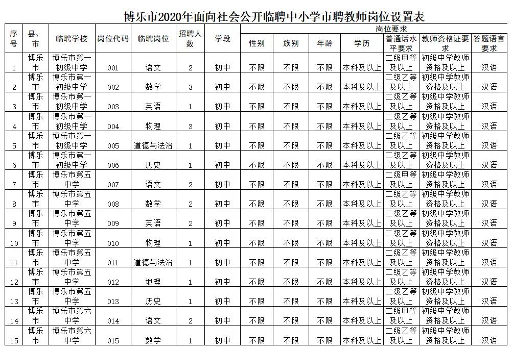 6.符合臨聘崗位所需的其他資格條件,詳見(jiàn)《2020年春季博樂(lè)市教育系統(tǒng)面向社會(huì)公開(kāi)教師崗位表》。