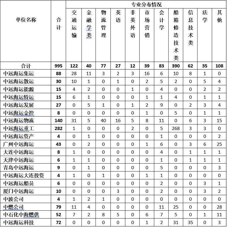 為配合“一帶一路”建設和集團業(yè)務拓展需要,集團直屬23家單位2020年擬面向全國重點高校招聘交通運輸、物流、外語、法律、財會(審計)、金融、船舶與海洋工程等專業(yè)優(yōu)秀應屆畢業(yè)生。