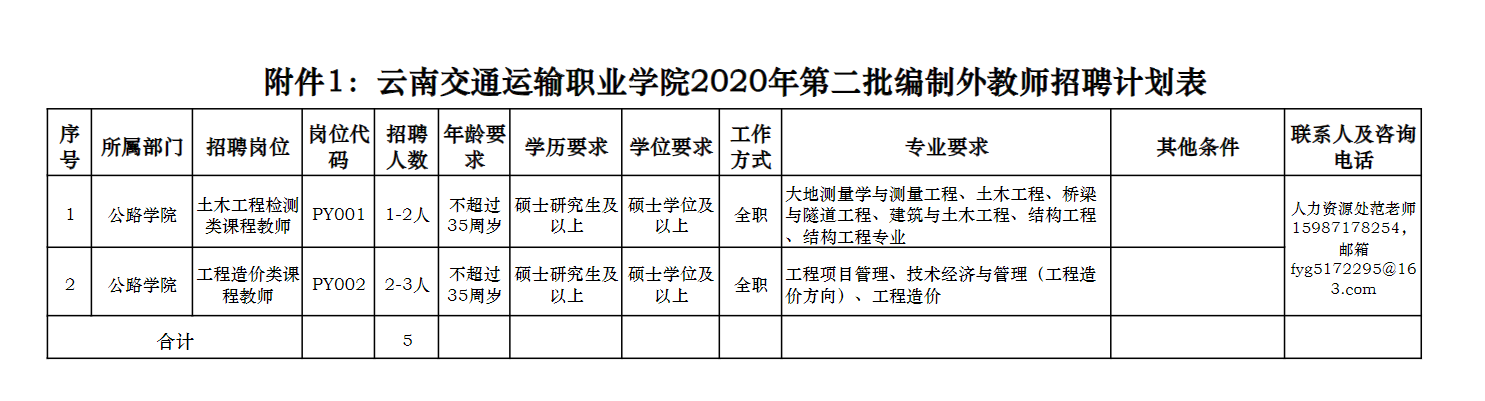 附件1:云南交通運輸職業(yè)學院2020年第二批編制外教師招聘計劃表