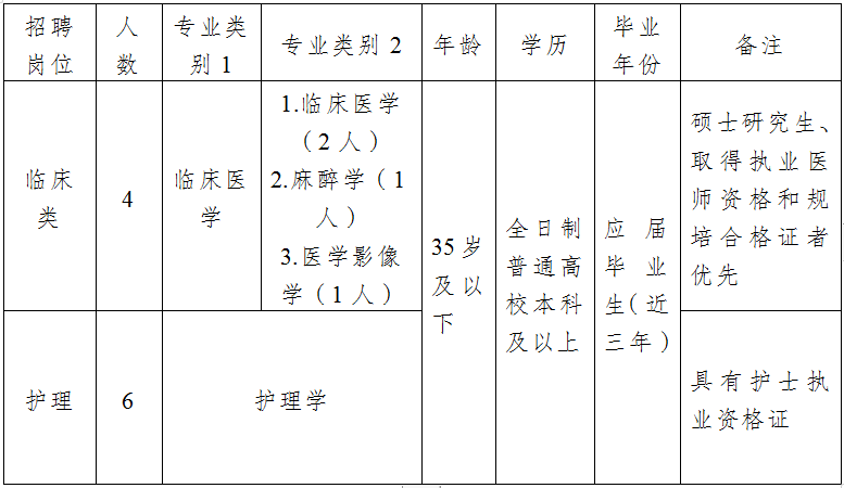 (1)應聘人員應為全日制普通高等醫(yī)學院本科及以上學歷,年齡在35歲以下,臨床醫(yī)學專業(yè),具有醫(yī)學學士及以上學位,同等條件具有執(zhí)業(yè)資格、規(guī)培合格證者優(yōu)先;