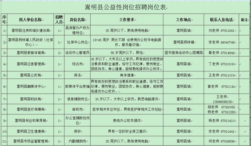 招聘具體事宜請咨詢用人單位,符合公益性崗位上崗條件的個人也可以到嵩明縣勞動就業(yè)服務局綜合科申請公益性崗位求職登記,詳詢陳老師:0871-67917444。
