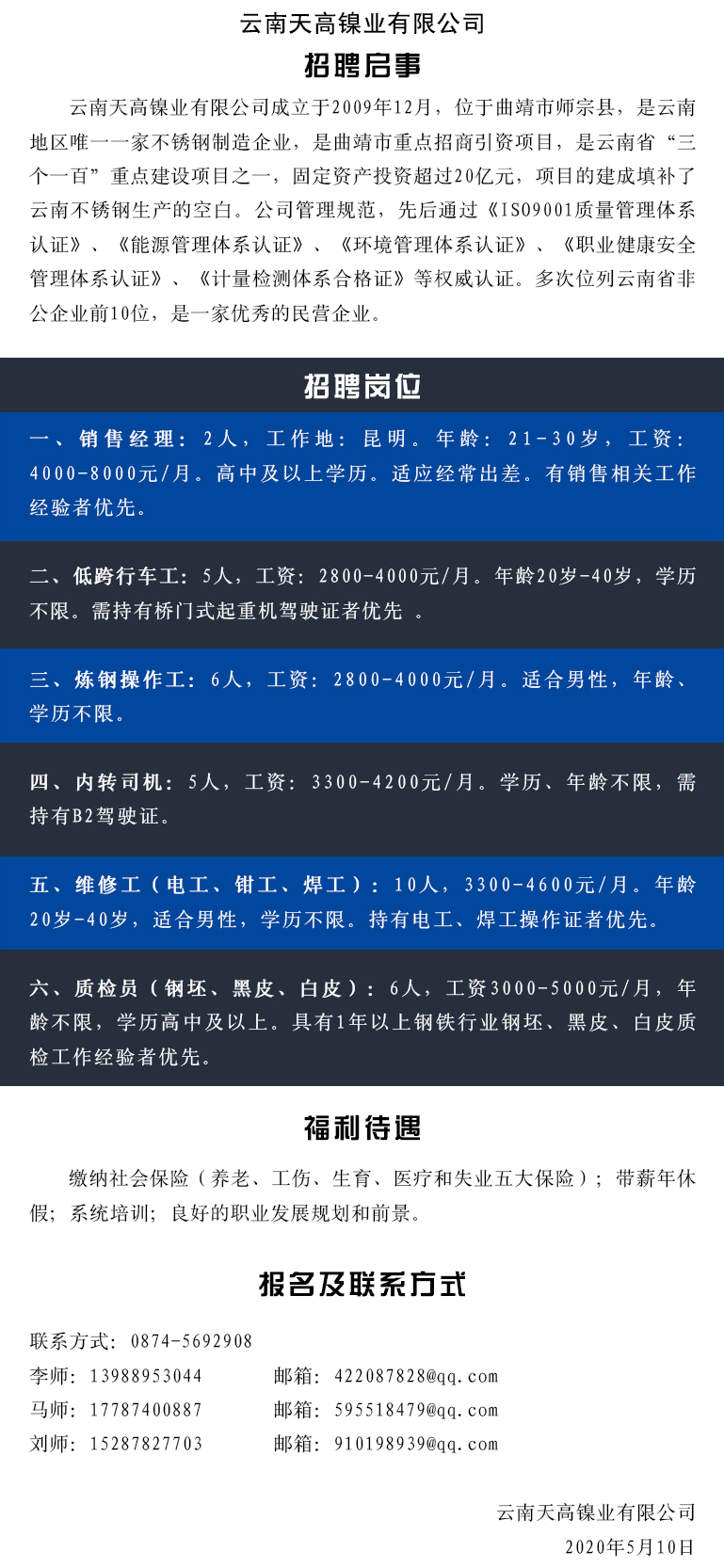 2020年云南天高鎳業(yè)有限公司招聘啟事