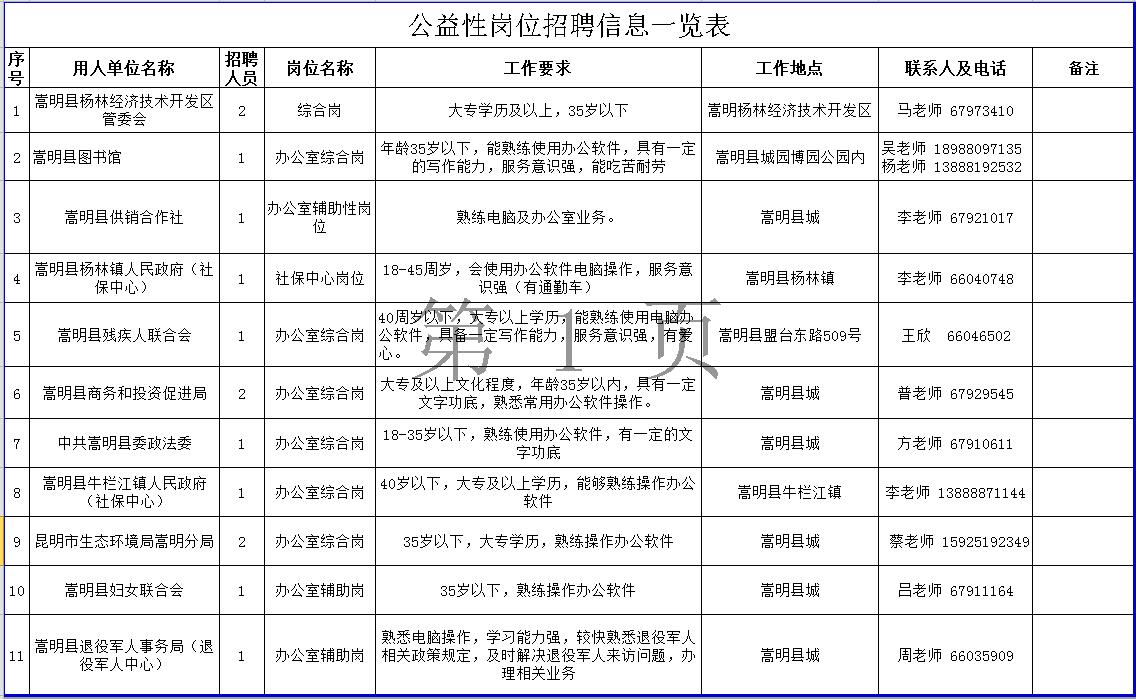 招聘具體事宜請(qǐng)咨詢用人單位。符合公益性崗位上崗條件的個(gè)人也可以到嵩明縣勞動(dòng)就業(yè)服務(wù)局綜合科申請(qǐng)公益性崗位求職登記,詳詢陳老師:0871-67917444。