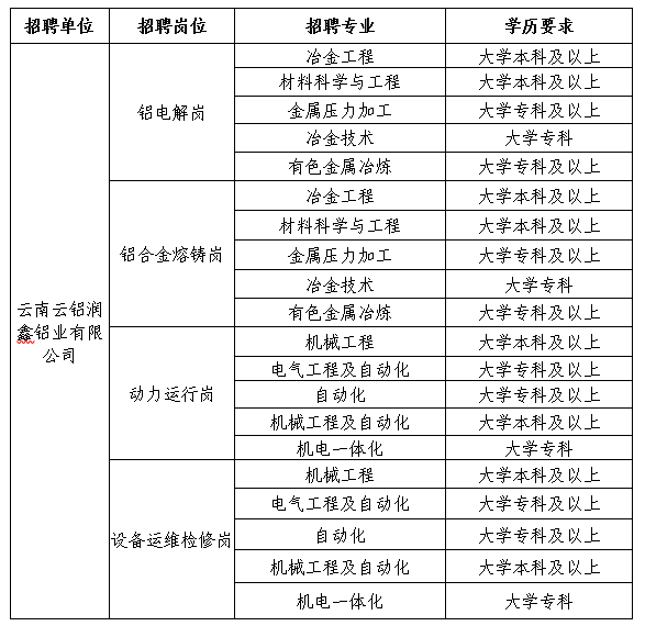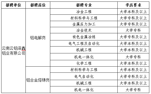 | 云南云鋁涌鑫鋁業(yè)有限公司 | 鋁電解崗 | 冶金工程 | 大學(xué)本科及以上 |
