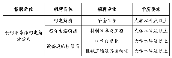 | 云南云鋁海鑫鋁業(yè)有限公司 | 鋁電解崗 | 冶金工程 | 大學(xué)本科及以上 |